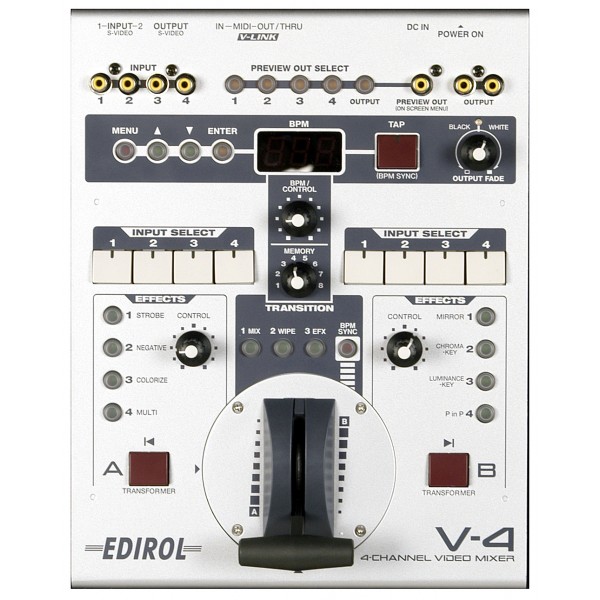 SD 4 kanaals composiet video mixer, monitor uitgang en met diverse effecten.