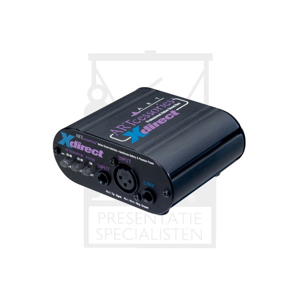 D.I. box, schakelbaar tussen actief en passief. Voeding doormiddel van internet 9V batterij.