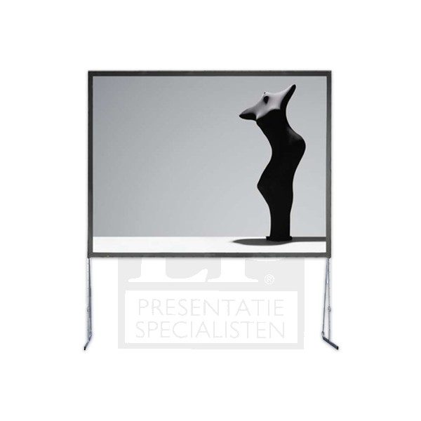 Betreft hier wat verouderde schermen! • 5cm zwarte rand • Inclusief 2 staanders • Inclusief 4 vlinderbouten • Transportkoffer •