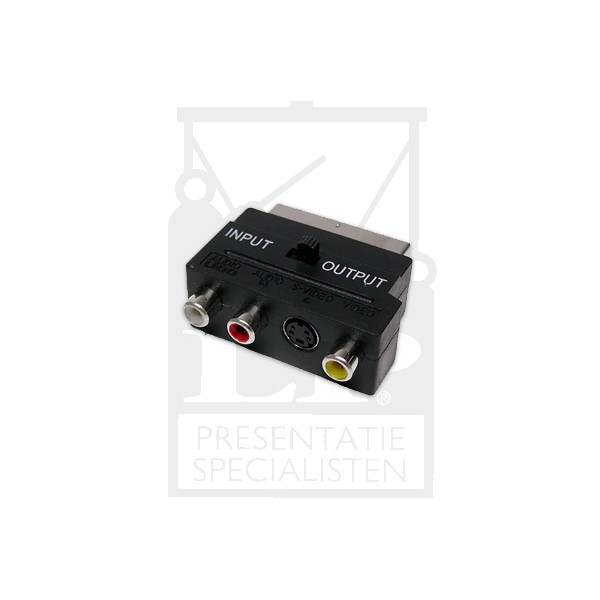 • Adapter 3x Cinch (AV) + S-Video naar Scart (volledig bedraad) • Met in/uit schakelaar •